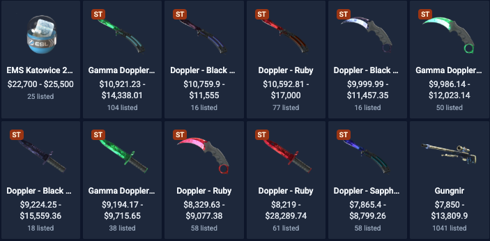 Snapshot of some of the high value skins currently trading on one of many marketplaces. Source: Price Empire