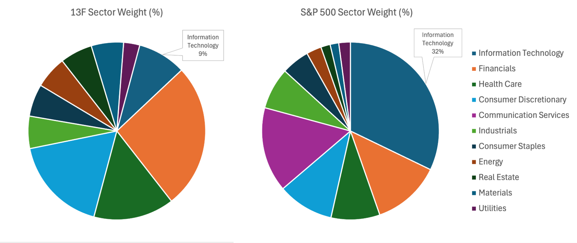 Figures based on the 15 November 2025 rebalance. The 13F strategy is shown on a model equal-weighted basis to illustrate industrial composition relative to the market-cap weighted S&P 500. This model may vary from actual holdings due to market fluctuations and timing of fund inflows.