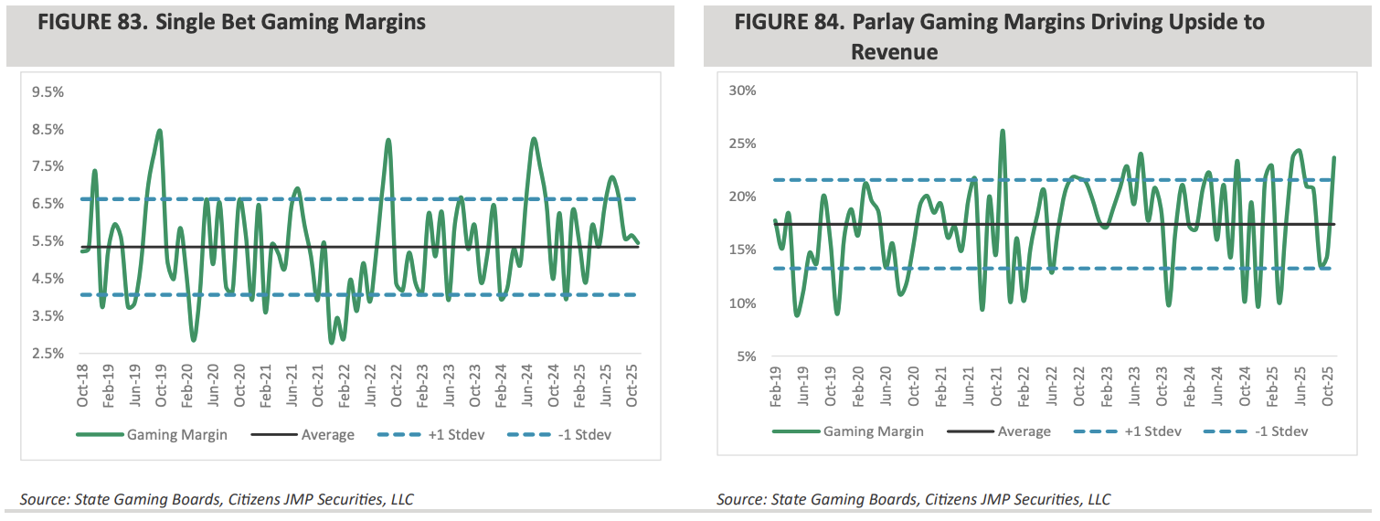 The large differential between gaming margins for US bookmakers on single bets vs parlays. Source: Citizens Bank